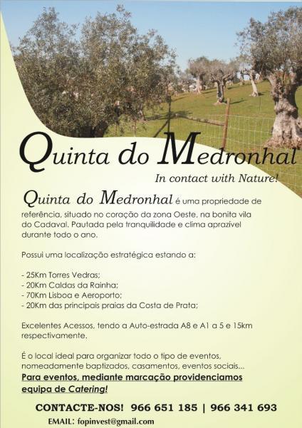A Quinta do Medronhal é uma Propriedade de referência, com uma área total de 5 hectares, situada no coração da zona Oeste, na bonita vila do Cadaval. Pautada pela tranquilidade e clima aprazível durante todo o ano.